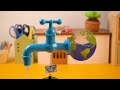 Place the tap next to a fish tank or against a wall to create a fascinating illusion! Add an art template to the water tap (like the rocket provided) to make a fun decoration.