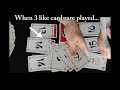 In Karma, each player is dealt three face-down cards that he cannot look at and that remain on the table in front of him. He is dealt six more cards, chooses three of those for his hand, and places the remaining three face-up onto his table cards in three separate stacks. One player begins by placing a card or cards of the same value from his hand onto the table face-up to create a discard pile. The other players in turn must place onto the discard stack a card or cards of the same value that match(es) or exceed(s) the value of the top card of the stack; or else, pick up the stack. Until the draw pile is gone, players must draw at the end of their turns to maintain a hand of at least three cards.